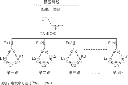 低壓TSC動態(tài)無功補(bǔ)償裝置采用人工智能控制,由控制器、雙向可控硅、電容器、電抗器、保護(hù)元件等組成??刂破鲗?shí)時(shí)跟蹤測量負(fù)荷的功率因數(shù)和無功電流,與預(yù)先設(shè)定的給定值進(jìn)線比較,動態(tài)控制電容器組的投切,以保證功率因數(shù)達(dá)到設(shè)定值。整個(gè)測量執(zhí)行過程在一個(gè)周波內(nèi)完成(時(shí)間<20ms),并實(shí)現(xiàn)可控硅過零觸發(fā),確保投切電容器無沖擊、無涌流、無過渡過程
