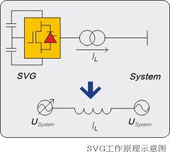 SVG是屬于柔性交流輸電系統(tǒng)(FACTS)的重要裝置,是繼電容器補(bǔ)償、磁控電抗器MCR型SVC、TCR型SVC之后的第三代動(dòng)態(tài)無(wú)功補(bǔ)償技術(shù)。它以三相大功率電壓逆變器為核心,其輸出電壓通過(guò)變壓器或電抗器接入系統(tǒng),與系統(tǒng)側(cè)電壓保持同頻、同相,通過(guò)調(diào)節(jié)其輸出電壓幅值與系統(tǒng)電壓幅值的關(guān)系來(lái)確定輸出功率的性質(zhì)與容量,當(dāng)其幅值大于系統(tǒng)側(cè)電壓幅值時(shí)輸出容性無(wú)功,小于時(shí)輸出感性無(wú)功。其原理如右圖所示。