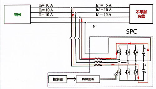 DESPC裝置開(kāi)啟后,通過(guò)外接電流互感器(CT)實(shí)時(shí)檢測(cè)系統(tǒng)電流,并將系統(tǒng)電流信息發(fā)送給內(nèi)部控制器進(jìn)行處理分析,以判斷系統(tǒng)是否處于不平衡狀態(tài),同時(shí)計(jì)算出達(dá)到平衡狀態(tài)時(shí)各相所需轉(zhuǎn)換的電流值,然后將信號(hào)發(fā)送給內(nèi)部IGBT并驅(qū)動(dòng)其動(dòng)作,將不平衡電流從電流大的相轉(zhuǎn)移到電流小的相,最后達(dá)到三相平衡狀態(tài)。